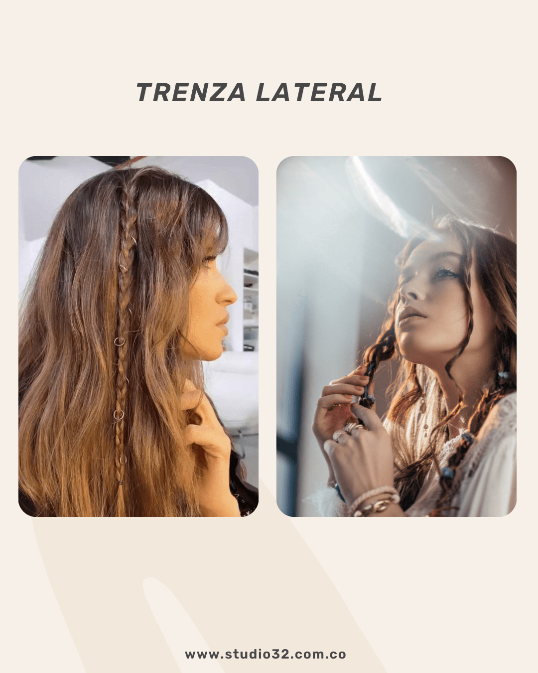 Esta opción combina el encanto de las trenzas con la belleza de llevar el cabello suelto. Al llevar una trenza que se extiende hacia un lado del cabello suelto, se agrega un toque bohemio, elegante y relajado. La trenza es versátil porque se adapta a diferentes estilos y ocasiones, podrá optar por una trenza lateral apretada y pulida para eventos más formales o una trenza lateral suelta y despeinada para un estilo más fresco y relajado; además, podrá agregar accesorios como: flores, pinzas y cintas que le darán mayor personalidad al peinado.